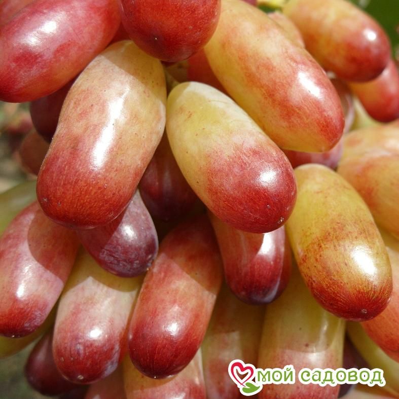 Виноград Маникюр фингер (Япония) – пользующийся большой популярностью в Японии столовый сорт, которые имеет средне-поздние сроки созревания. Оригинальная форма ягоды (пальцы женщины с красным лаком) не может не обратить на себя внимание. Ягода очень крупная с восхитительной сладко-хрустящей мякотью. Кожица очень тонкая и не терпкая. Магазин Мой Садовод, рекомендации по уходу Уход за виноградом сводится к регулярным поливам в сухую погоду, подкормкам и формированию куста. Для подкормки используют минеральные и органические удобрения (перепревший навоз, компост). Ранней весной кусты виноград поливают полным минеральным удобрением, растворенным в воде, перед цветением такую подкормку повторяют. Перед созреванием вносят фосфорно-калийные удобрения, а после сбора урожая проводят подкормку калием для повышения зимостойкости растений. Кроме того для лучшего вызревания лозы рекомендуется удаление пасынков и прищипывание верхушек в начале сентября. Формирование куста Винограда. Для формирования виноградных кустов необходимо установить надежную опору. Самая простая представляет собой два столба с несколькими рядами проволоки между ними. По мере роста побеги подвязывают к проволоке, задавая им нужное направление. Формирование куста винограда начинают с первого года, оставляя не более двух здоровых побегов у основания, остальные выламывают. На второй год на кусте оставляют по три почки на каждом побеге, на третий год на каждом плече оставляют 2-3 сильных побега, остальные удаляют. Пожалуйста, помните, что транспортировка и пересадка — стресс для растения. Перед высадкой в открытый грунт обработайте корневую систему стимулятором роста. С заботой о растениях, Мой Садовод.   В нашем интернет-магазине вы сможете купить Столовые сорта Так же возможно вас заинтересуют Виноград Лора и Виноград Кодрянка